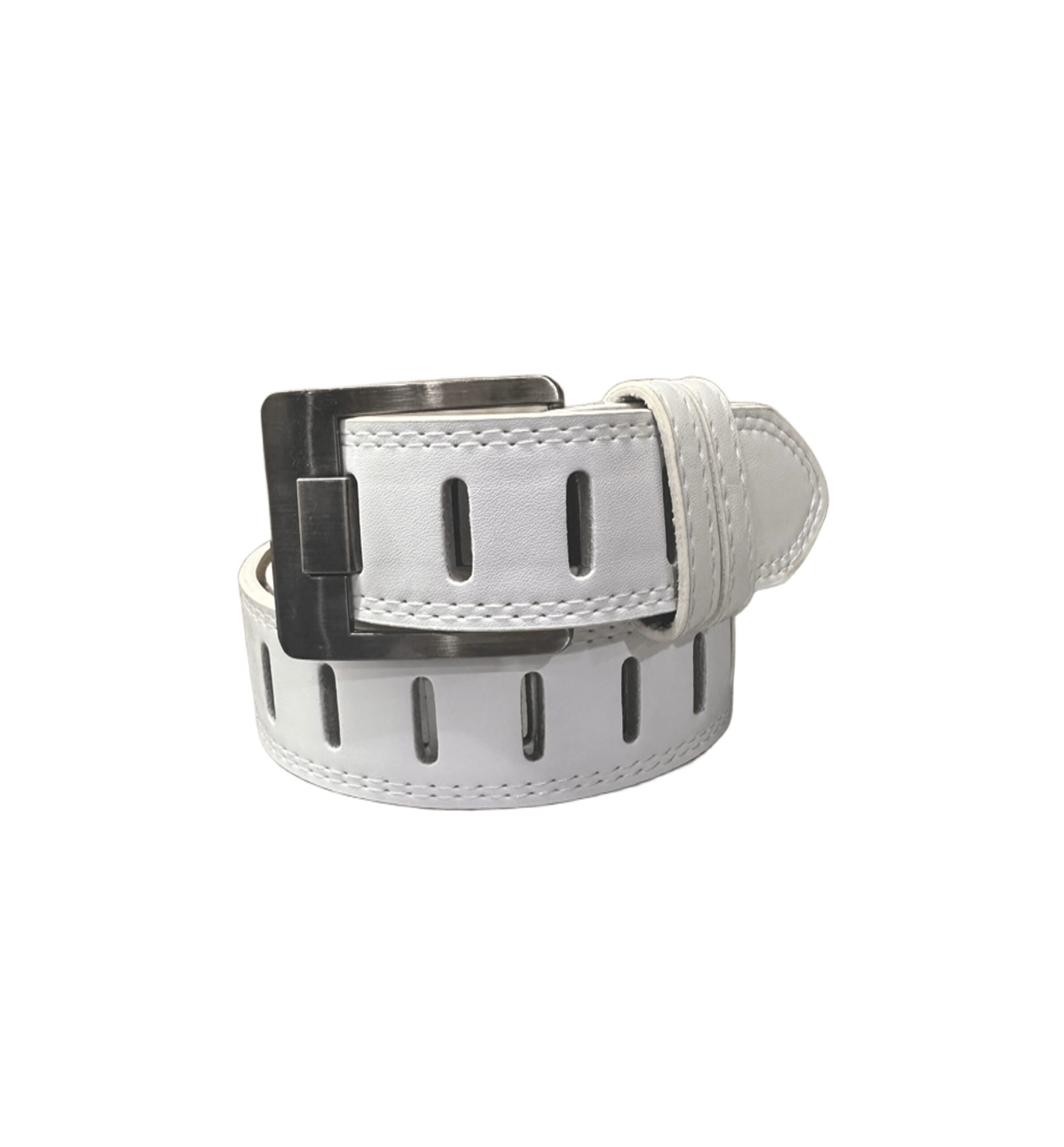Класически дамски колан от еко кожа в бял цвят, дълъг 110 см и широк 3,5 см, за елегантни и стилни комбинации.