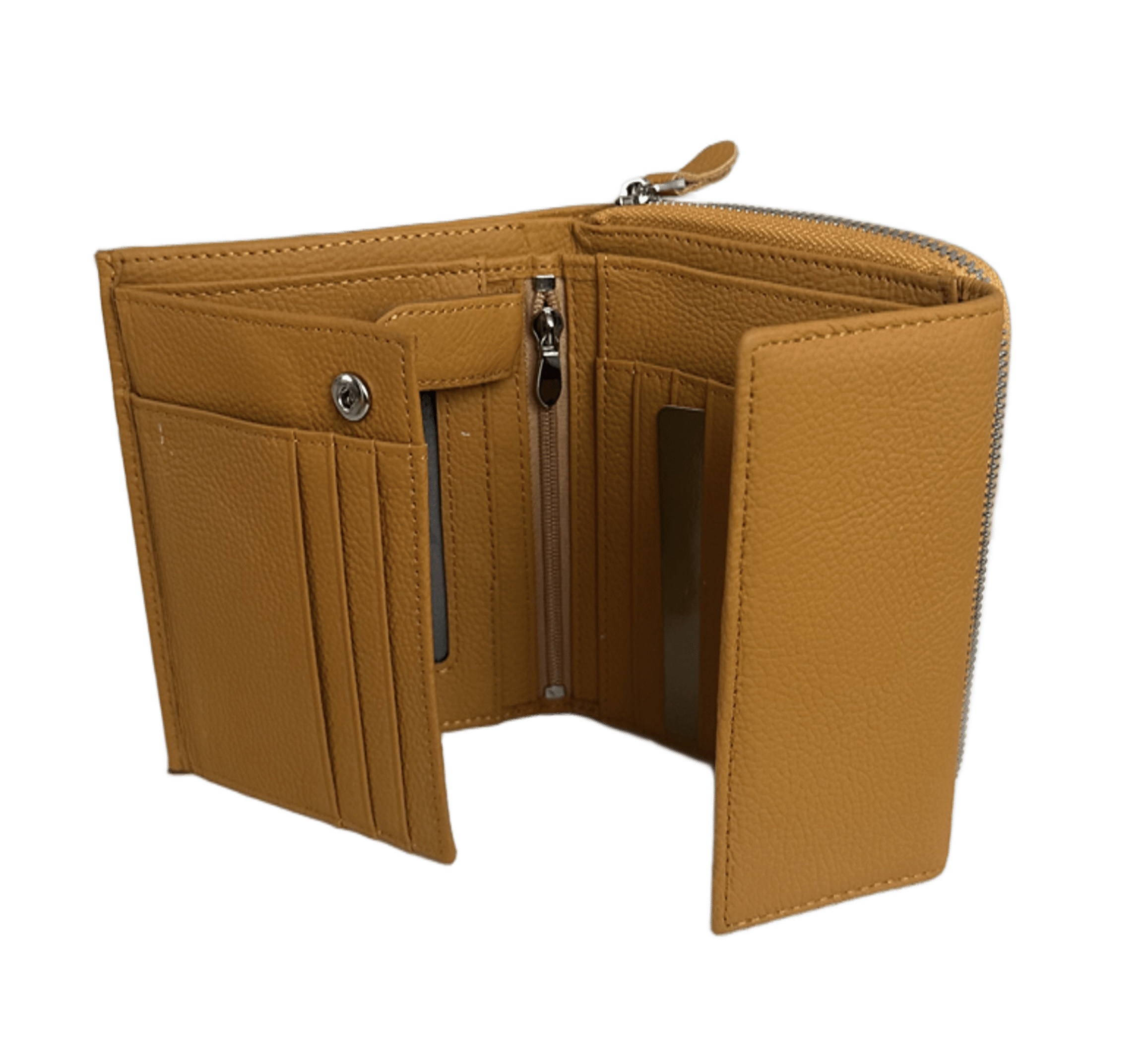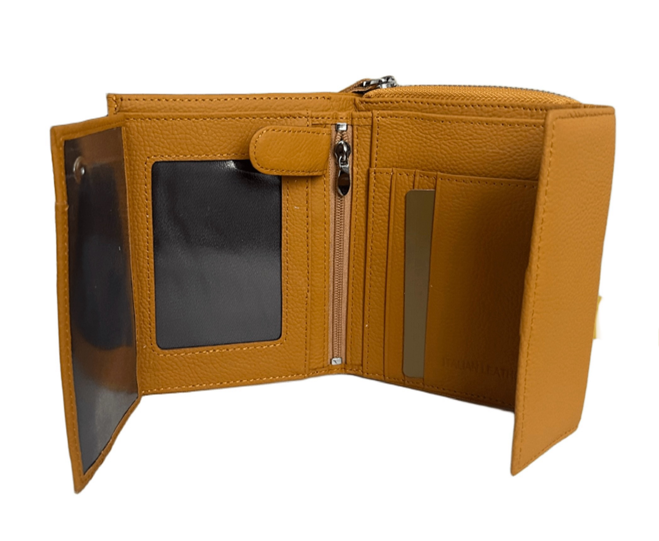 Дамски портфейл изработен от висококачествена естествена кожа в цвят горчица. Портфейла разполага с едно отделение за банкноти, отделение за монети затварящо се посредством цип, 12 отделения за карти/документи.