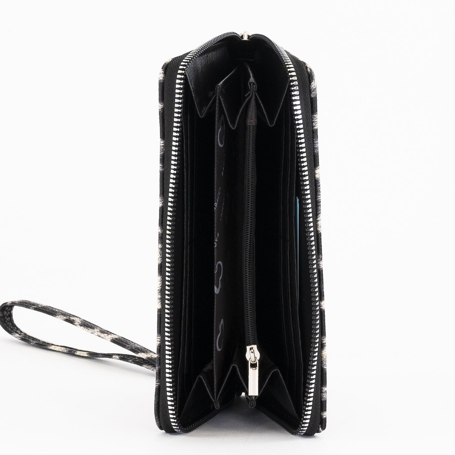 Модела разполага с три отделения за банкноти – затварящи се с общ цип, осем отделения за карти/документи и отделение за монети .