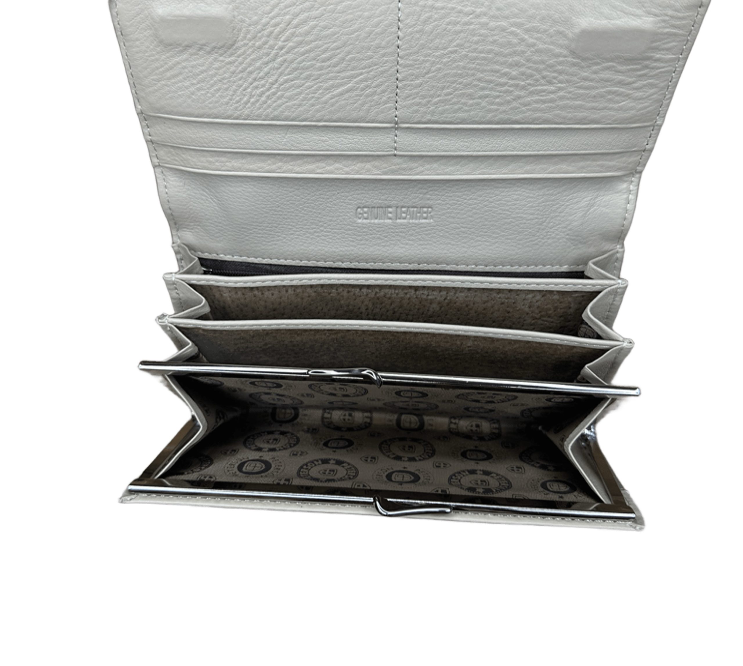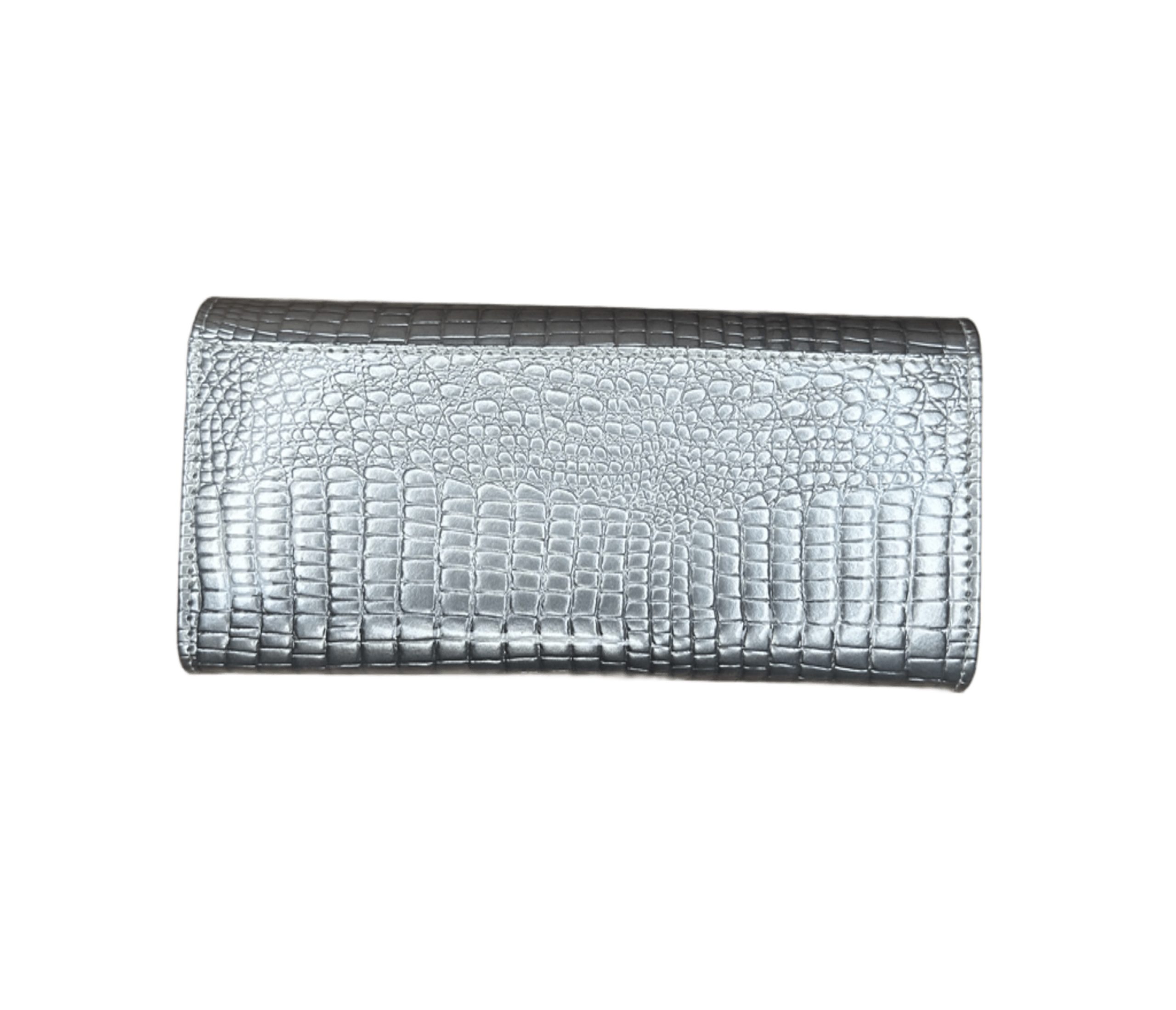 Това изискано лачено дамско портмоне е изработено от висококачествена естествена кожа, която гарантира дълготрайност и луксозно усещане. Сребристият цвят придава класа и стил, а лаченото покритие добавя изтънчен блясък, който няма да остане незабелязан.