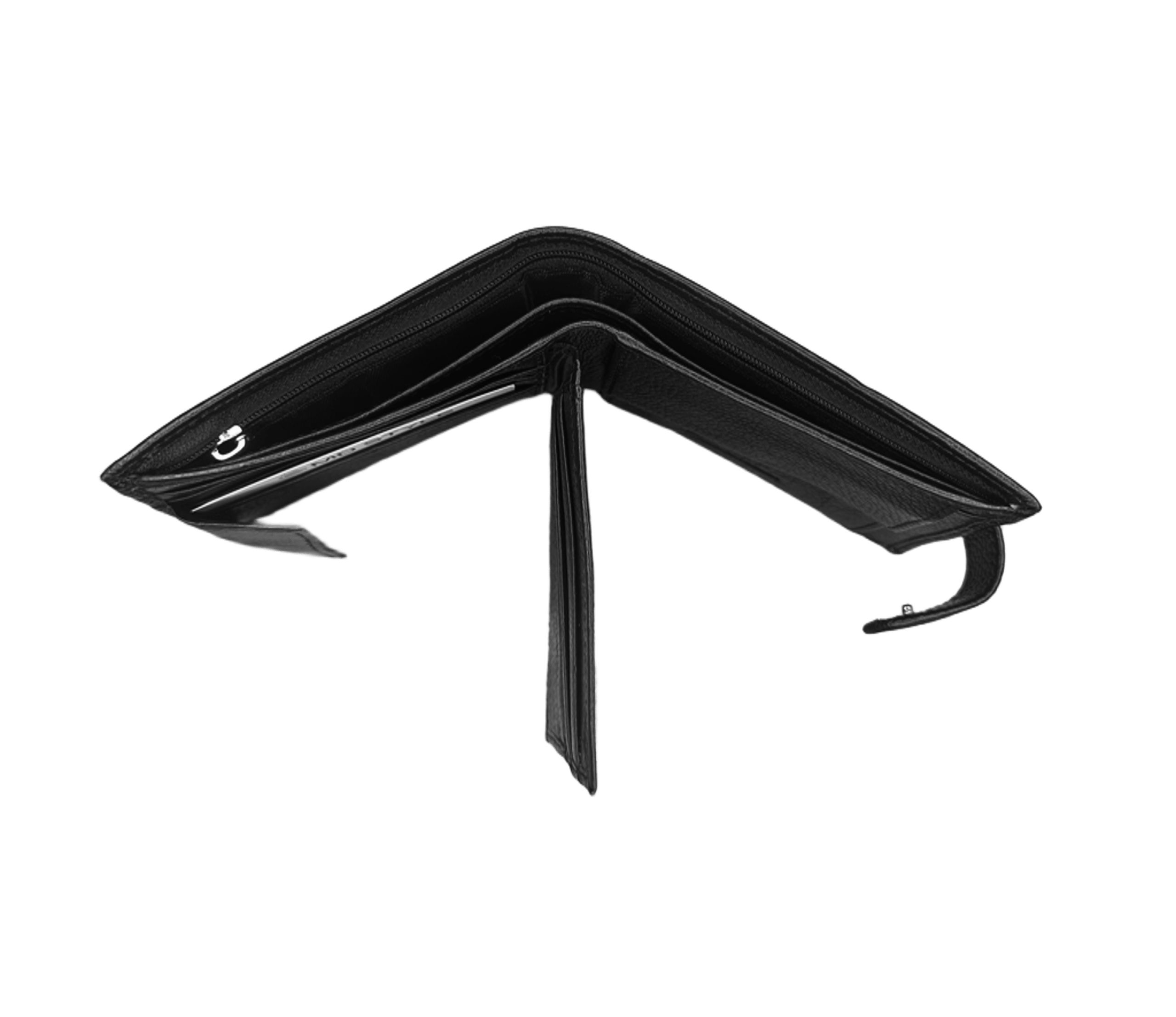 Портфейла разполага с 2 отделения за банкноти, допълнително отделение с цип, монетник и 12 отделения за карти/документи. Закопчаването е посредством копче.